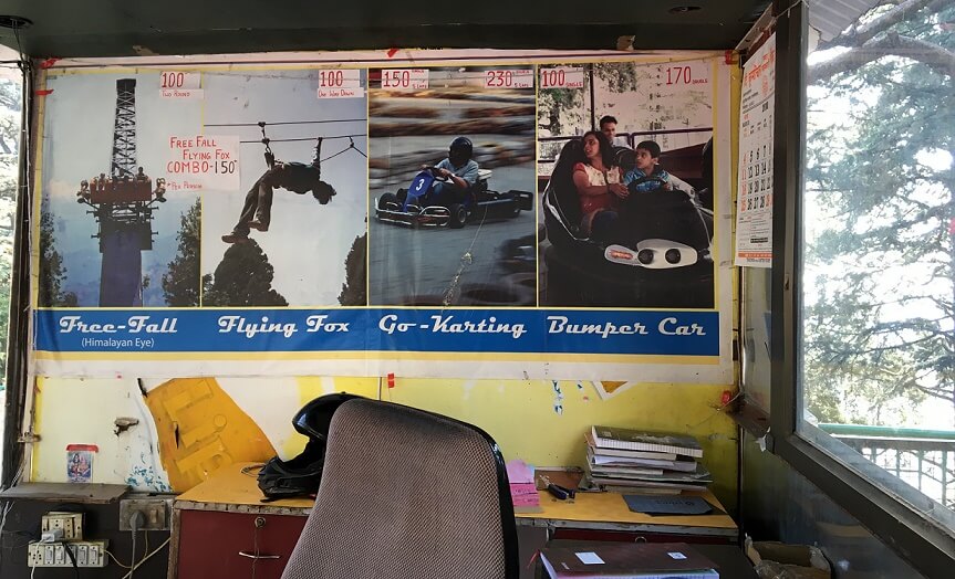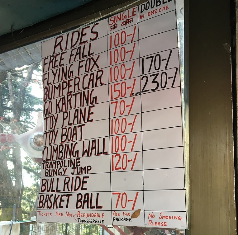 It is located 3 km away from Nainital, and can reached easily by road or in a ropeway from Mallital. You can also do a variety of adventure activities near snow view point. some of them are Free Fall (Himalayan Eye ), Flying Fox, Go-Karting, Bumper Car, Toy Plane, Climbing Wall, Bull Ride, Trampoline Bungy Jumping etc. For your information, we have also added a list of those activities with their cost in the below picture.